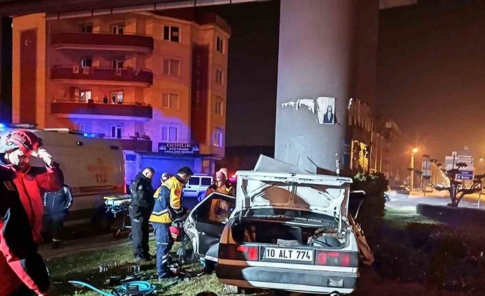 Balıkesir’de otomobiliyle üst geçit ayağına çarpan sürücü sıkışarak hayatını kaybetti.