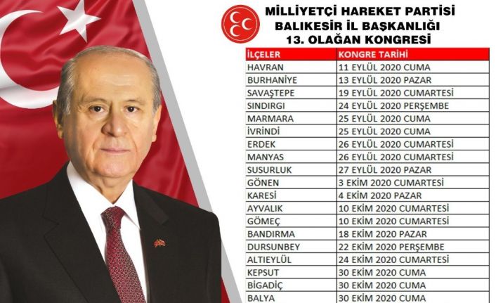 MHP Balıkesir İl Başkanlığından yapılan açıklamada 11 Eylül’de Havran ilçe kongresi ile başlayacak ve 31 Ekim’de Edremit ilçe kongresi ile bitecek. MHP Balıkesir İl Başkanlığından yapılan açıklamada 11 Eylül Havran İlçe kongresi, 13 Eylül Burhaniye, 19 Eylül Savaştepe, 24 Eylül, Sındırgı, 25 Eylül İvrindi ve Marmara, 26 Eylül Erdek ve Manyas, 27 Eylül Susurluk, 3 Ekim Gönen, 4 Ekim Karesi, 10 Ekim Ayvalık ve Gömeç, 18 Ekim Bandırma, 22 Ekim Dursunbey, 24 Ekim Altıeylül, 30 Balya, Kepsut ve Bigadiç ve 31 Ekim Edremit ilçe kongreleri yapılacağı açıklandı.