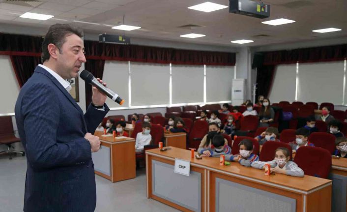 Ziyaretin ilk bölümünde öğrenciler, Belediye Meclis Salonunda yapılan toplantıda Başkanı Tolga Tosun ile bir araya geldiler. Kendilerine kek ve meyve suları ikram edilen minikler, Belediye Başkanını adeta soru yağmuruna tuttular.