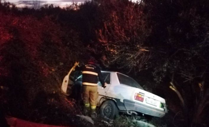Balıkesir’in Edremit ilçesinde bariyerleri aşarak şarampole uçan araçtan sürücü, burnu bile kanamadan kurtuldu.