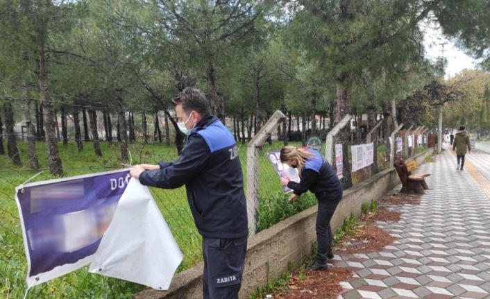 Burhaniye Belediyesi, son zamanlarda artan izinsiz afiş ve reklam faaliyetlerine “Dur” dedi. Burhaniye Belediyesi Zabıta Müdürlüğü ekiplerince yapılan çalışma ile ilçede çevre ve görüntü kirliliğine neden olan izinsiz asılan reklam afişleri kaldırıldı.
