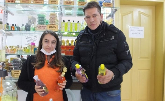 Burhaniye ilçesinde, 26 yaşındaki Mert Altınten, dedesinin mesleği olan kolonyacılığı seçti. Eşi Funda Altınten ile birlikte kolonya satan genç, pandemi döneminde kolonyayı herkese tavsiye ettiğini söyledi.
