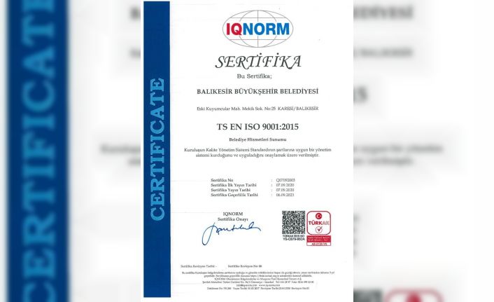 Balıkesir Büyükşehir Belediyesi pandemiye rağmen çalışma kalitesinden taviz vermeyerek ‘ISO 9001 Kalite Yönetim Sistemi’ belgesini yeniden almaya hak kazandı.