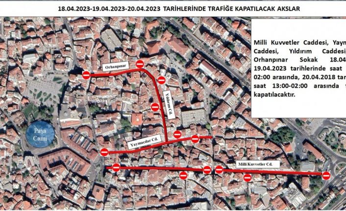 17 Nisan salı günü saat 16.00 ile saat 02.00 arasında İğneci Sokak, Zağnos Paşa Caddesi - Turan Caddesi kesişimine kadar olan kısım, Ketenavdan Sokak ve Başyunak Sokak trafiğe kapatılacaktır.