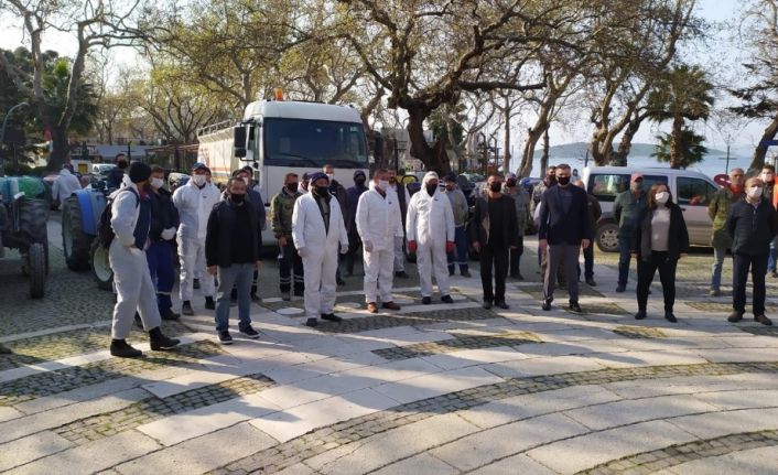 Çiftçiler Erdek’i traktörlerle dezenfekte etti