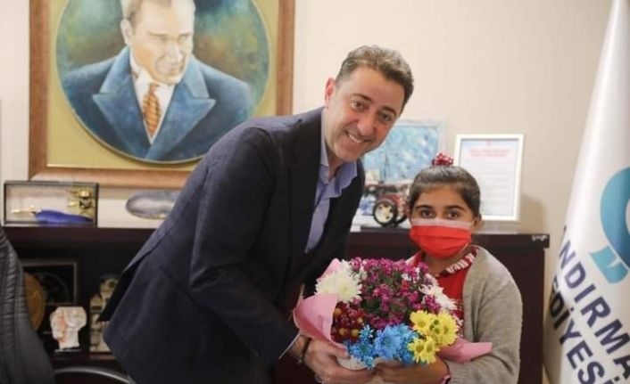 Balıkesir’in Bandırma İlçesinde Çalışkanlar İlkokulu öğrencileri Belediye Başkanı Tolga Tosun’ u ziyaret ederek kendilerinin ürettiği zeytinyağını hediye ettiler.