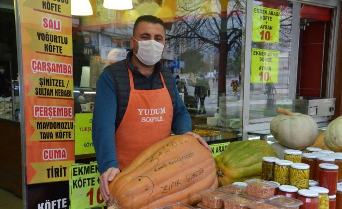 Balıkesir’in Karesi ilçesinde bulunan bir lokantada ortalama 30 kilogram olan bu kabaklar Balıkesirli vatandaşlar tarafından büyük bir ilgiyle karşılandı. Bu dev kabakların tohumlarını almak isteyenlerin adeta sıraya girdiğini belirten Mürsel Erol, kabaklarda suni gübre kullanmadığını ifade ederek “Özen göstererek su ile büyüttüm” dedi.