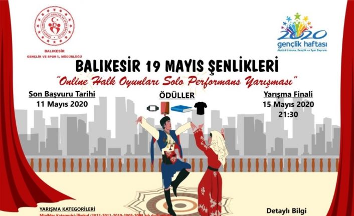 Balıkesir 19 Mayıs Şenlikleri kapsamında düzenlen Online Halk Oyunları Solo Performans Yarışması başlıyor. Balıkesir Gençlik ve Spor İl Müdürlüğü, korona virüsü salgını nedeniyle 2020 Gençlik Haftası için herkesin evlerinden dijital olarak katılabileceği kutlama programları hazırladı.