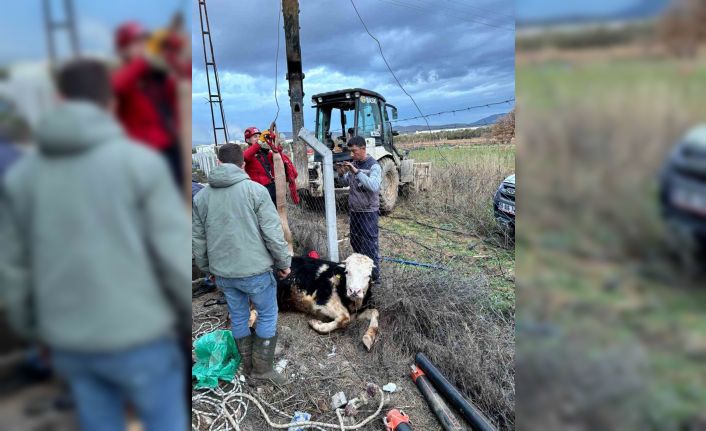 Balıkesir’in Gömeç ilçesinde bir çiftlikte su kuyusuna düşen inek, itfaiye ekiplerinin uzun uğraşıları sonucunda kurtarıldı.