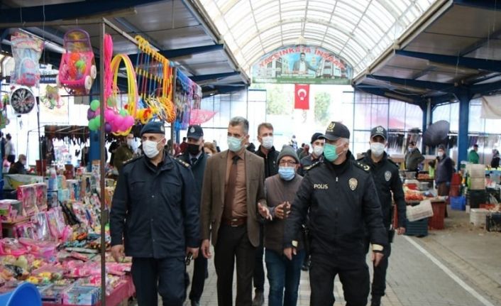 İlçe Hıfzıssıhha Kurulunun en son kararlarının uygulanma düzeyini yerinde görmek ve denetlemek üzere vatandaşlarımızın en çok bir araya geldiği yerlerden biri olan pazaryerini ziyaret eden Kaymakam Yurt, alınan son tedbirler doğrultusunda pazaryeri girişlerinde oluşturulan kontrol noktasında incelemelerde bulundu.