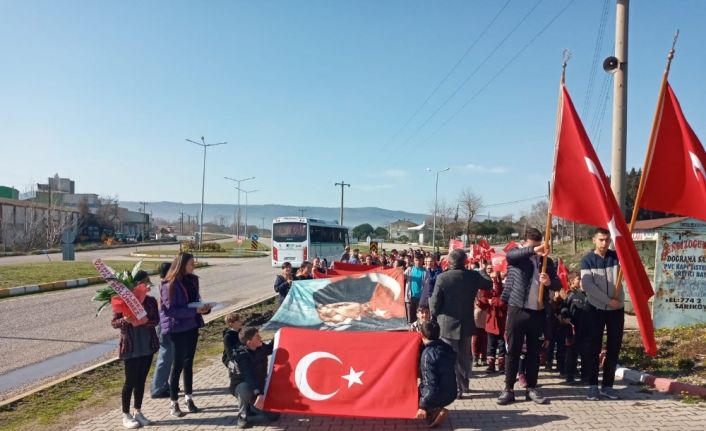 Gönen ilçesine bağlı Sarıköy’de bulunan eğitim kurumlarındaki öğrenci ve eğitimciler Mehmetçiğe destek yürüyüşü yaptılar. Yürüyüşe katılanlara jandarma ekipleri çikolata dağıtarak, teşekkür etti.