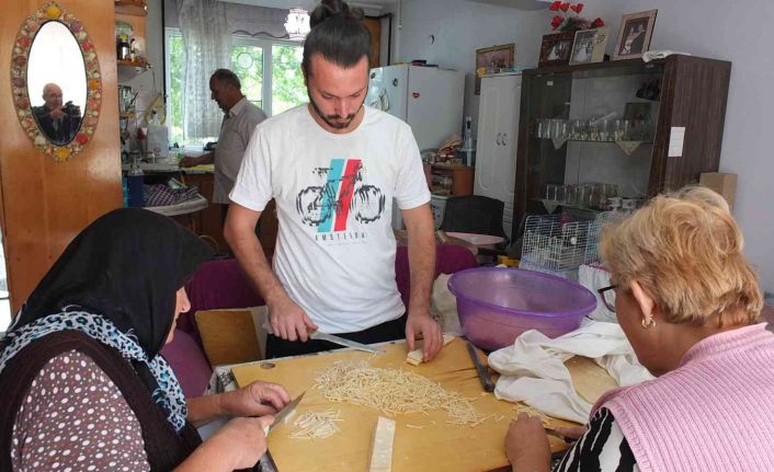 Ören Mahallesi Eczacı Rasim Caddesinde, Hüseyin-Fatma Bilecen çiftinin evinde bir araya gelen kadınlar kışlık makarna hazırlarken, erkeklerde onlara yardımcı oldu. Açılan hamurlar sacda pişirilip ince ince doğranıyor. Daha sonra kurutulan makarnalar kışın sofralara gelecek. Kadınlara yardımcı olduklarını anlatan Hüseyin Bilecen, “Bayanların evde erişte yapmalarına yardım ediyoruz. Ben pişirici olarak yardım ediyorum. Diğerleri kesiyor, açıyor. İşte, hayat böylece devam ediyor. Kışında Allah nasip ederse bunları yiyeceğiz” dedi. Fatma Bilecen de, “Gençliğimde hiç yapmadığım şeyi ben Ören’e geldiğimde burada öğrendim. Komşularımız da hepsi bana yardımcı oluyor. Torunlarıma yapıyorum. Sonra yiyeceğiz afiyetle. Allah razı olsun komşularımızdan. Torunlarımı çok seviyorlar. Biz bunları imece usulü ile yapıyoruz. Erkeklerde bize yardımcı oluyor” dedi. Uğur Ateş ise, “Bizde İzmir’den geldik. Mahallede imece ile erişte yapıyorlarmış. Bizde destek oluyoruz. Bir yandan kesiyoruz, pişiriyoruz. Kışında İnşallah, nasipse yiyeceğiz” diye konuştu