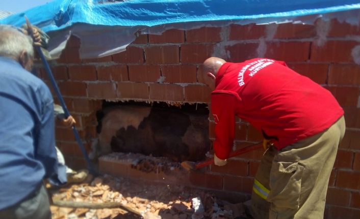 Balıkesir’in Havran ilçesinde yem oluğuna girerek sıkışan inek, itfaiye ekipleri tarafından ahırın duvarı kırılarak kurtarıldı.