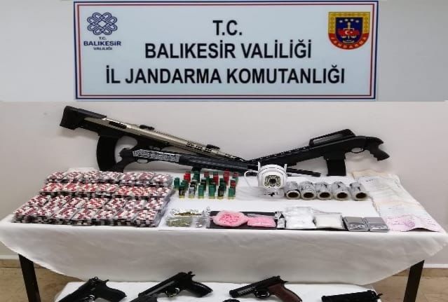 Balıkesir’de jandarma ekipleri istihbarı çalışmalar neticesinde; Altıeylül, Ayvalık, Burhaniye, Edremit, İvrindi, Karesi, Marmara ilçelerinde meydana gelen 23 kaçakçılık ve organize suç olayına karışan 38 şüpheliye ait ev ve eklentileri ile kullanmış oldukları araçlarında yapılan operasyon faaliyeti sonucu; 5 bin 640 adet sentetik uyuşturucu hap, 633 adet ectasy, 393 gram metamfetamin, 228 adet kenevir bitkisi, 135 gram skunk, 17 gram bonzai, 12 gram kubar esrar, 8 adet tabanca, 4 adet av tüfeği, 462 adet tabanca ve av tüfeği fişeği, 2 adet hassas terazi, 14 adet uyuşturucu kullanma aparatı. 1 adet şişme bot, 1 adet tekne motoru ve 87 bin 100 TL suçtan elde edilen gelir ele geçirildi. Olaylara karışan 38 şüpheli şahıs hakkında adli işlem yapılarak, adli makamlara sevk edilen 6 şahıs tutuklandı.