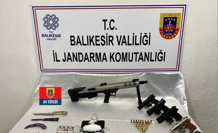 Balıkesir İl Jandarma Komutanlığınca, silah mühimmat ile uyuşturucu madde imal ve ticaretine yönelik yapılan istihbari çalışmalar neticesinde Balıkesir’in Bandırma ilçesinde silah mühimmat ve uyuşturucu madde imal ve ticareti yaptığı tespit edilen bir şüphelinin üzerinde ve ikamet adreslerinde yapılan aramalarda; 112 gram metamfetamin, 5 gram kubar esrar, 20 adet sentetik uyuşturucu hap, 5 adet tabanca, 1 adet av tüfeği, 36 adet tabanca fişeği, 5 adet şarjör ve 4 adet bıçak ele geçirildi. Olaylara karışan 1 şüpheli hakkında adli tahkikata başlanıldı.