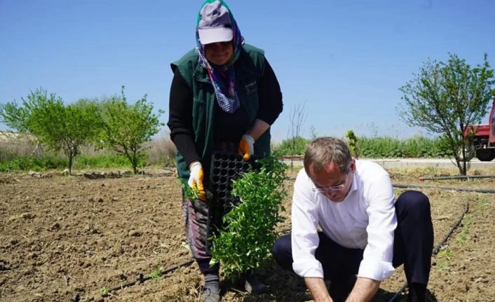 Başkan Ergin daha sonra kadın işçiler ile birlikte tarlaya fide dikimi yaptı.