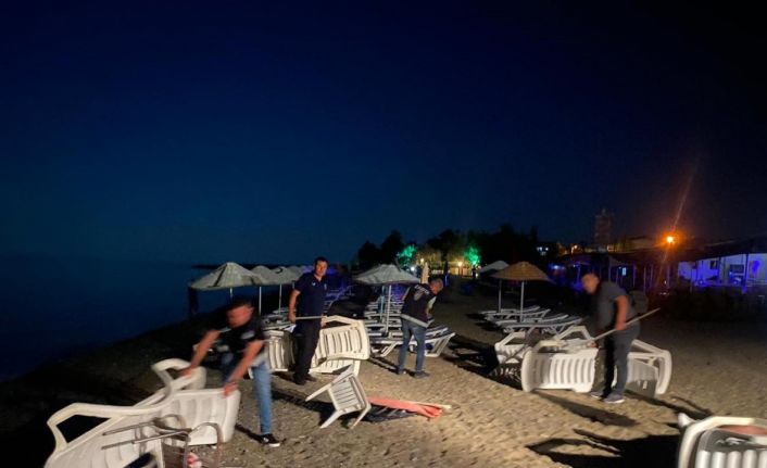 Balıkesir’in Edremit Belediyesi ekipleri sahillerde uyarı ve ikazlara rağmen sabit bırakılan şezlong ve şemsiyeleri topladı.