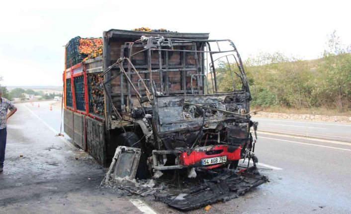 Çanakkale’nin Lâpseki ilçesinden, Bursa toptancı haline giden 54 AGB 764 plakalı Cahit Karateke (55) kontrolündeki kamyon motor kısmından alev aldı. Alevi gören sürücü kamyonu durdurup inerken, yangın kısa sürede büyüdü. İhbar üzerine olay yerine itfaiye ve emniyet ekipleri sevk edildi. İtfaiye ekipleri, yangını kısa sürede söndürdü. Yangında alev topuna dönen kamyon kullanılamaz hale gelirken, karayolundaki ulaşım bir süre trafiğe kapatıldı. Kamyonun içerisinde bulunan şeftalilerin bir kısmı yangından zarar gördü. Emniyet ekipleri güvenlik önlemleri alırken yangında zarar görmeyen meyvelere bir başka kamyona taşındı. Zarar gören kamyon çekici vasıtasıyla çekildi ve yol normale döndü. Yangınla ilgili soruşturma başlatıldı.