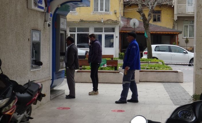 Balıkesir’in Sındırgı Belediyesi korona virüs bulaşma riskini azaltmak amacıyla vatandaşların sıraya girdikleri yerlerde birbirlerine en az 1 metre mesafe bırakmasını sağlayacak zemin çıkartmalarını yerleştirmeye de devam ediyor.