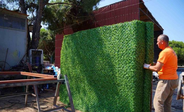 Balıkesir’in Ayvalık ilçesinde, Ayvalık Belediyesi Temizlik İşleri Müdürlüğü ekipleri kentin farklı noktalarında daha estetik bir görünüm sağlamak için konteynerlerini suni çim ile kaplıyor.