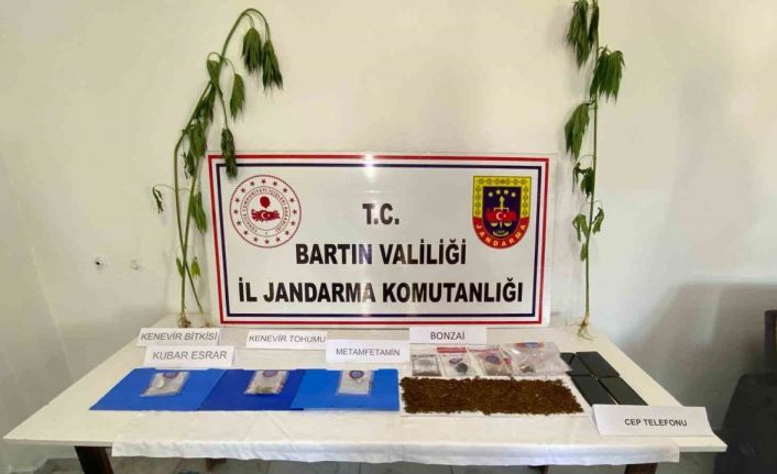 Bartın, Zonguldak, İstanbul illerinde, Bartın Jandarma Komutanlığı ekipleri tarafından şafak vakti eş zamanlı operasyon yapıldı. Operasyonlarda 4 kişi gözaltına alınırken, şahısların üzerinde ve ikametlerinde gerçekleştirilen aramalarda ise 42 gram bonzai, 1 gram metamfetamin, 1 gram kubar esrar, 4 gram kenevir tohumu, 3 kök kenevir bitkisi, 3 adet kuru sıkı tabanca, 117 adet 9 mm tabanca fişeği, 22 adet 7,65 mm tabanca fişeği, 1 adet bandrolsüz viski, 2 adet bandrolsüz votka, 1 adet kılıç, 1 adet elektronik sigara, 4 adet cep telefonu, suçtan elde edildiği değerlendirilen 54 bin 500 TL nakit para ele geçirildi.