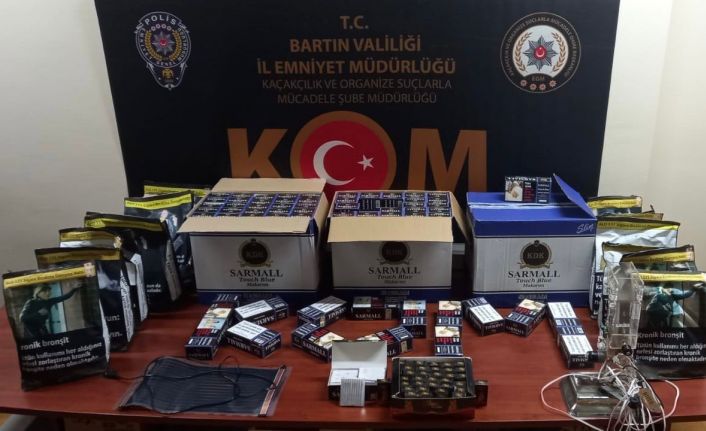 Bartın Emniyet Müdürlüğü Kaçakçılık ve Organize Suçlarla Mücadele şubesi ekipleri, yürüttüğü çalışmalarda M. Y. isimli şahsın makoron sigara satışı yaptığı tespit etti. Şahsın evine operasyon düzenleyen ekipler, Toplamda 23 bin 600 paket bandrolsüz ve sahte bandrollü makoron, 14 kilogram kıyılmış sigara tütünü, 10 paket içi tütünle doldurulmuş içime ve satışa hazır makoron sigara, 34 paket sigara filtresi, 1 adet tütün kurutmak için kullanılan mekanizma, 1 adet sigara sarma makinesi ele geçirildi.