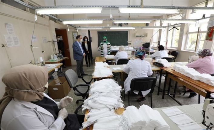 Vali Güner, Şerife Bacı Mesleki ve Teknik Anadolu Lisesinde Halk Eğitim Merkezi ve Akşam Sanat Okulunda görev alan Usta öğreticiler tarafından gönüllü olarak mevcut imkânlarla günlük 3 bin adet tek kullanımlık cerrahi maske üretildiğini ifade etti.