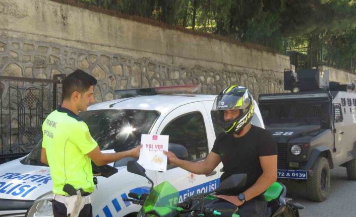 KASK TAKAN MOTOSİKLET SÜRÜCÜLERİNE TEŞEKKÜR EDEN EKİPLER, KASK TAKMAYANLARA İSE TAKMAMA NEDENLERİNİ SORARAK BİLGİLENDİRİCİ BROŞÜR DAĞITTI.