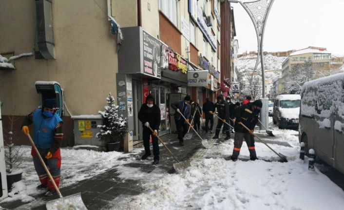 Araç ve yaya trafiğinin olumsuz etkilenmemesi için yoğun çaba sarf eden ekiplerin bir kısmı da şehrin en işlek caddesi olan Cumhuriyet Caddesi’nde bulunan kaldırımlarda kar küreme çalışması yapıyor.