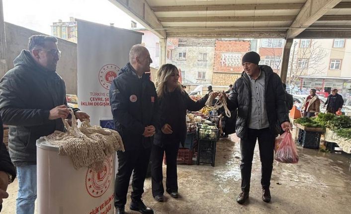 Pazar alışverişi yapan vatandaşlarla birebir iletişim kurulan etkinlikte, naylon poşet kullanımının azaltılması maksadıyla pazar filesi dağıtıldı.