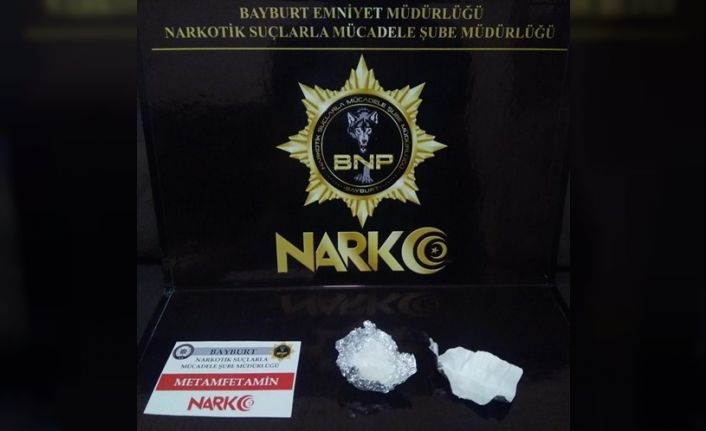 Bayburt Emniyet Müdürlüğü Narkotik Suçlarla Mücadele Şube Müdürlüğü ekiplerince, uyuşturucu ve uyarıcı madde suçlarına yönelik yapılan çalışmalar kapsamında; Ü.Ö., F.T., M.B. isimli şahısların uyuşturucu madde nakledebileceği değerlendirilmesi üzerine şahısların kullandığı araç kent girişinde durduruldu. Yapılan aramada bir miktar metamfetamin ve bir miktar esrar maddesi ele geçirildi.