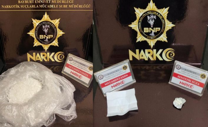 Bayburt Emniyet Müdürlüğü Narkotik Suçlarla Mücadele Şube ekiplerince, uyuşturucu ve uyarıcı madde ticareti ve kullanımını bertaraf etmeye yönelik yapılan çalışmalarda iki farklı olayda, 72,30 gram metamfetamin ve 2 adet sentetik ecza ele geçirildi. H.K. isimli şahıs gözaltına alındı ve hakkında uyuşturucu madde imal ve ticareti suçundan adli tahkikat başlatıldı. Ayrıca N.E.S. isimli şahıs hakkında uyuşturucu madde bulundurmak suçundan adli tahkikat başlatıldı.
