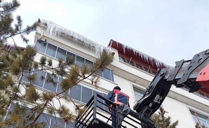Bayburt’ta etkili olan soğuk hava ve kar yağışının ardından Bayburt Belediyesi ekipleri, il genelinde bina saçaklarında oluşan buz sarkıtlarını temizledi.