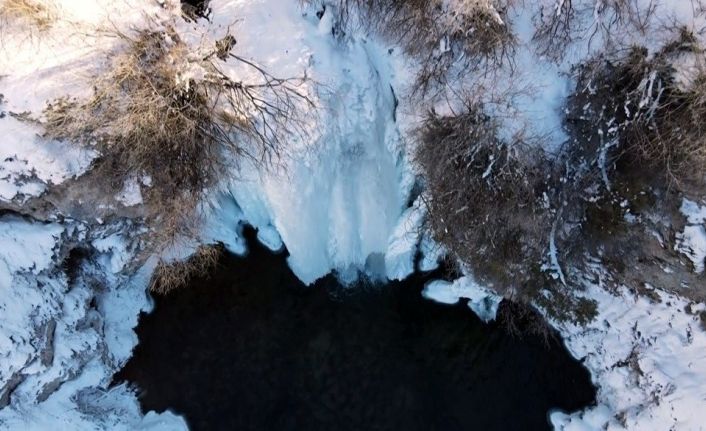 Hava sıcaklığının eksi 20 dereceye düştüğü Bayburt’ta buz tutan Sırakayalar Şelalesi, manzarasıyla adeta kartpostallık görüntü oluşturdu.