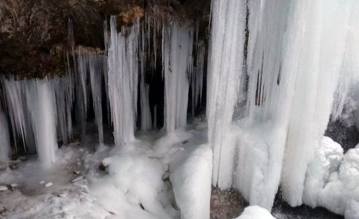 Bayburt’ta, her mevsim ziyaretçilerine ayrı bir güzellik sunan Sırakayalar Şelalesi, dondurucu soğuğun etkisiyle buz tuttu.