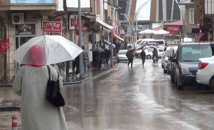 Bayburt’ta aniden başlayan yağmur etkisini artırarak yollarda su birikintileri oluşturdu. Dolu, yağmurla birlikte kısa süreli yağdıktan sonra, yerini sağanak yağışa bıraktı.