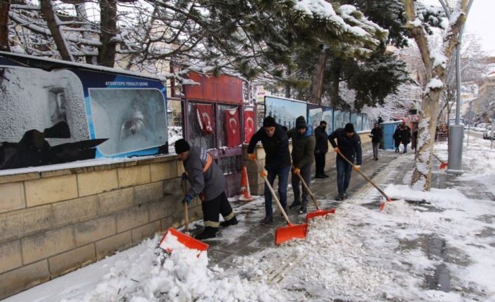 Ayrıca araç ve yaya trafiğinin olumsuz etkilenmemesi için yoğun çaba sarf eden ekiplerin bir kısmı da şehrin en işlek caddesi olan Cumhuriyet Caddesi’nde bulunan kaldırımlarda kar küreme çalışması yaparken bir diğer ekipte mahallelerden şehre inen merdivenlerde kar temizliği yapıyor.