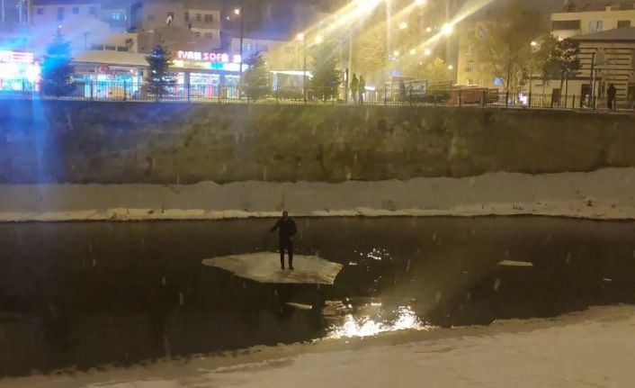 Bayburt’ta, kısmen donan Çoruh nehrinde, buz kütlesini sal gibi kullanarak nehirde ilerleyen bir kişi görenleri şaşırttı