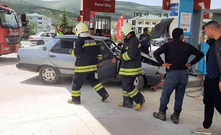 Bayburt’ta freni patlayan otomobil, akaryakıt istasyonundaki pompaya çarparak durdu. Güvenlik kamerasına yansıyan kazada 2 kişi yaralandı.