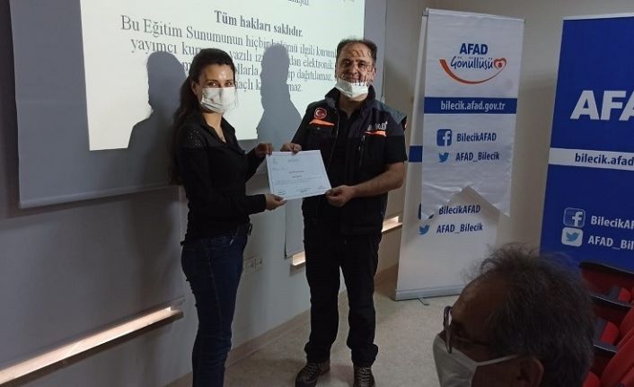 AFAD Bilecik İl Müdürlüğü ile Bilecik İl Sağlık Müdürlüğü koordinesinde gerçekleştirilen ilkyardım eğitimleri tamamlanarak sertifika almaya hak kazanan AFAD gönüllülerine sertifikaları AFAD Bilecik İl Müdürü Mehmet Hayri Demirel tarafından verildi. Eğitimlerde AFAD gönüllülerine genel ilkyardım bilgileri, hasta/yaralının ve olay yerinin değerlendirilmesi, temel yaşam desteği, kanamalarda ve yaralanmalarda ilkyardım, bilinç bozukluklarında ilkyardım, kırık, çıkık ve burkulmalarda ilkyardım, yanık, donma ve sıcak çarpmasında ilk yardım uygulamalar yaptırıldı. Eğitimde ayrıca zehirlenme, ısırma ve sokmalarda ilk yardım, göz kulak ve buruna yabancı cisim kaçmasında ilkyardım, boğulmalarda ilk yardım ve hasta /yaralı taşıma teknikleri ile ilgili bilgiler verildi.