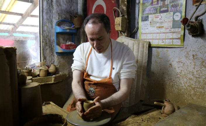 Sakarya’nın Geyve İlçe Belediye Başkanı Murat Kaya, Pazaryeri Belediye Başkanı Zekiye Tekin’i ziyaretinde çarkın başına geçip çömlek yaptı.