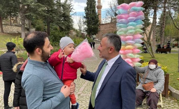 AK Parti Bilecik İl Başkanı Serkan Yıldırım, Şeyh Edebali Türbesini ziyaretinde etrafta bulunan çocuklara pamuk şekeri dağıtarak sevindirdi.