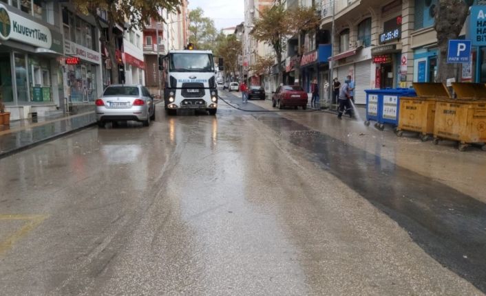 Bilecik Belediyesi tarafından gerçekleştirilen altyapı çalışması sonrasında asfaltlama işi tamamlanan alanlar yıkanarak temizleniyor.