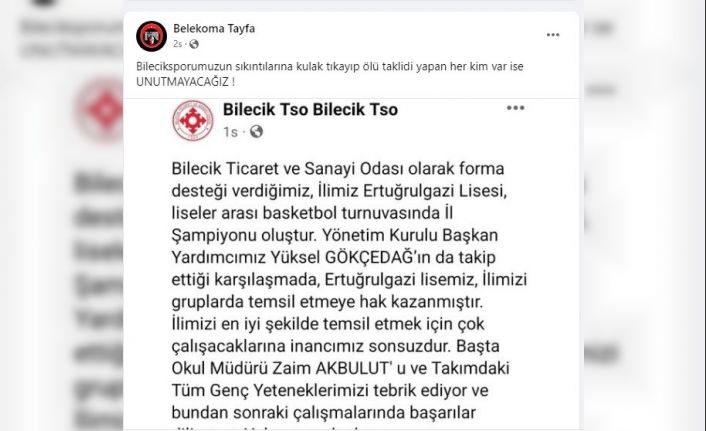Bu paylaşıma Bilecik TSO’ya Belekoma Taraftar Gurubu tepki gösterdi. Tayfa, Bilecik Ticaret ve Sanayi Odası resmi sosyal medyasından yaptığı paylaşımı etiket yaparak, "Bilecikspor’umuzun sıkıntılarına kulak tıkayıp ölü taklidi yapan her kim var ise unutmayacağız" dedi.