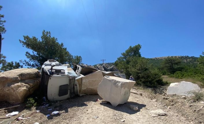 Bilecik’te mermer blok yüklü kamyonun devrilmesi sonucu sürücü ağır yaralandı.