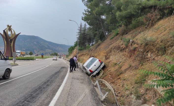 Bilecik’te kontrolden çıkan otomobil, bariyerlere çarparak yol kenarındaki su tahliye kanalına devrildi.