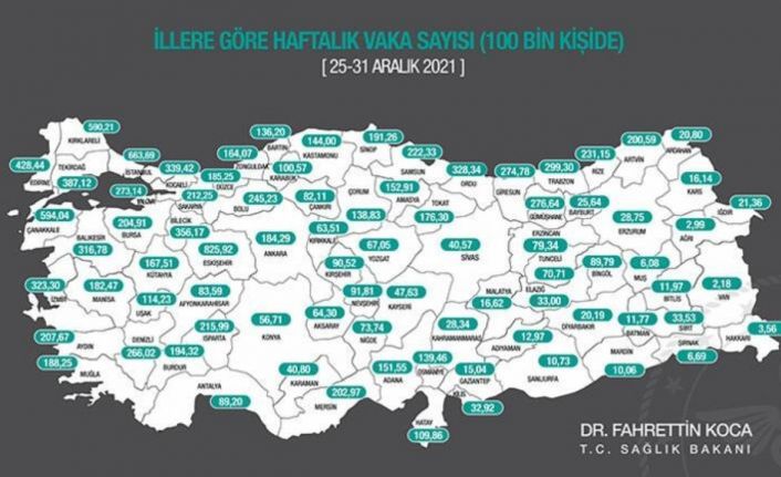 Sağlık Bakanı Fahrettin Koca, Twitter’daki hesabından 25-31 Aralık’ı kapsayan illere göre haftalık vaka sayısı haritasını paylaştı. Tabloya göre Türkiye’de, 25-31 Aralık tarihleri arasında Bilecik’te vaka sayısı her 100 bin kişide 356,17 olarak görüldü.