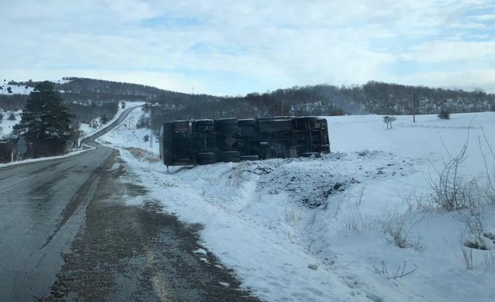 Bilecik’te seyir halindeyken yolun buzlu olması sebebiyle kontrolden çıkan tanker devrildi, sürücüsü yaralandı.