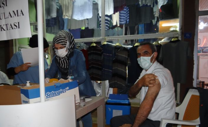 Bilecik’in Gölpazarı ilçesinde çarşı merkezinde kurulan mobil aşı istasyonunda vatandaşlara aşı yapılıyor,