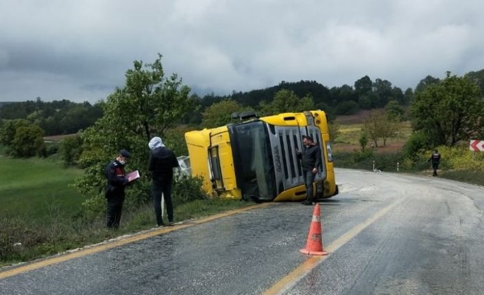 Bilecik-Bursa karayolunda meydana gelen trafik kazasında, seyir halindeki tırın yolun yağışlı olması sebebiyle virajı alamayarak devrilmesi sonucu 1 kişi yaralandı.